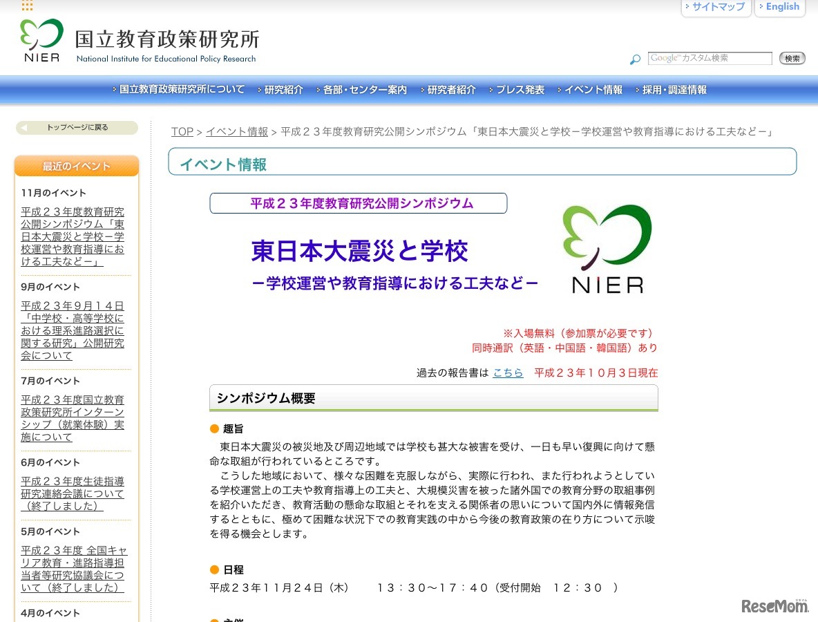 国立教育政策研究所は、平成23年度教育研究公開シンポジウム「東日本大震災と学校ー学校運営や教育指導における工夫などー」を11月24日に文部科学省講堂で開催する。