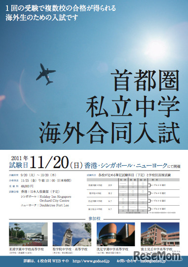 聖学院中学校・高等学校、洗足学園中学高等学校、富士見丘中学高等学校、茗溪学園中学校高等学校は11月20日、シンガポール、香港、ニューヨークで首都圏私立中学海外合同入試を実施する。