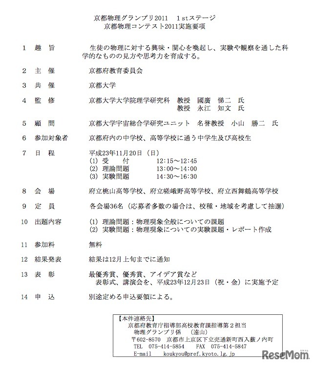 京都府教育委員会では、11月20日に府内の中高生を対象に実施する「京都物理コンテスト2011」の参加者を募集している。
