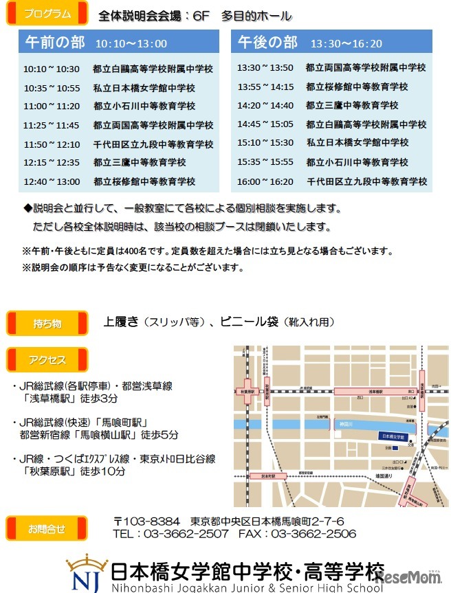 東京都立・区立中高一貫校と私立中の全7校が参加する「2011年度 公立・私立中高一貫校合同説明会」が10月23日に日本橋女学館中学校・高等学校で開催される。