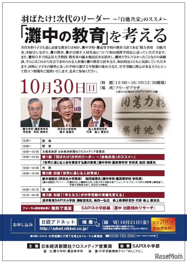 日本経済新聞社とサピックス小学部は、中学受験と子育てを考えるフォーラム「灘中の教育を考える」を10月30日に大阪・ブリーゼプラザにて開催する。