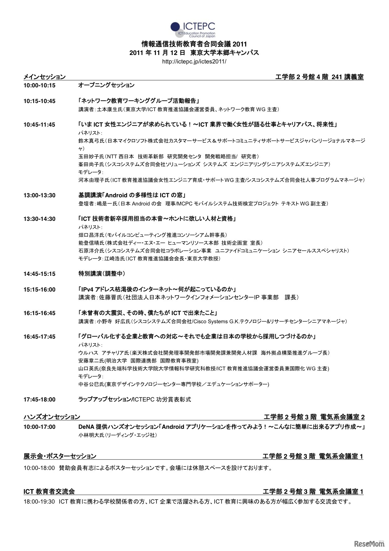 ICT教育推進協議会では、「情報通信技術教育者合同会議2011(略称:ICTES2011)」を11月12日に東京大学本郷キャンパスにて開催する。
