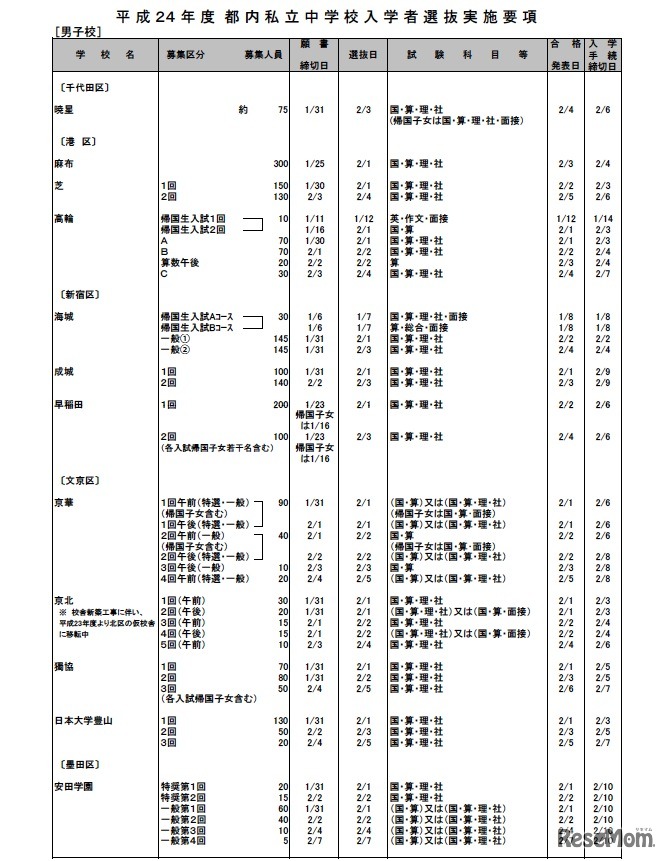 東京都は10月5日、平成24年度の都内私立中学校入学者選抜実施要項について取りまとめ、ホームページ上で公開した。