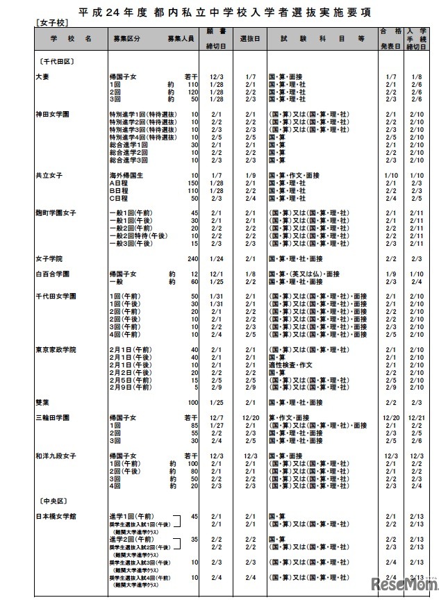 平成24年度都内私立中学校入学者選抜実施要項(女子校)