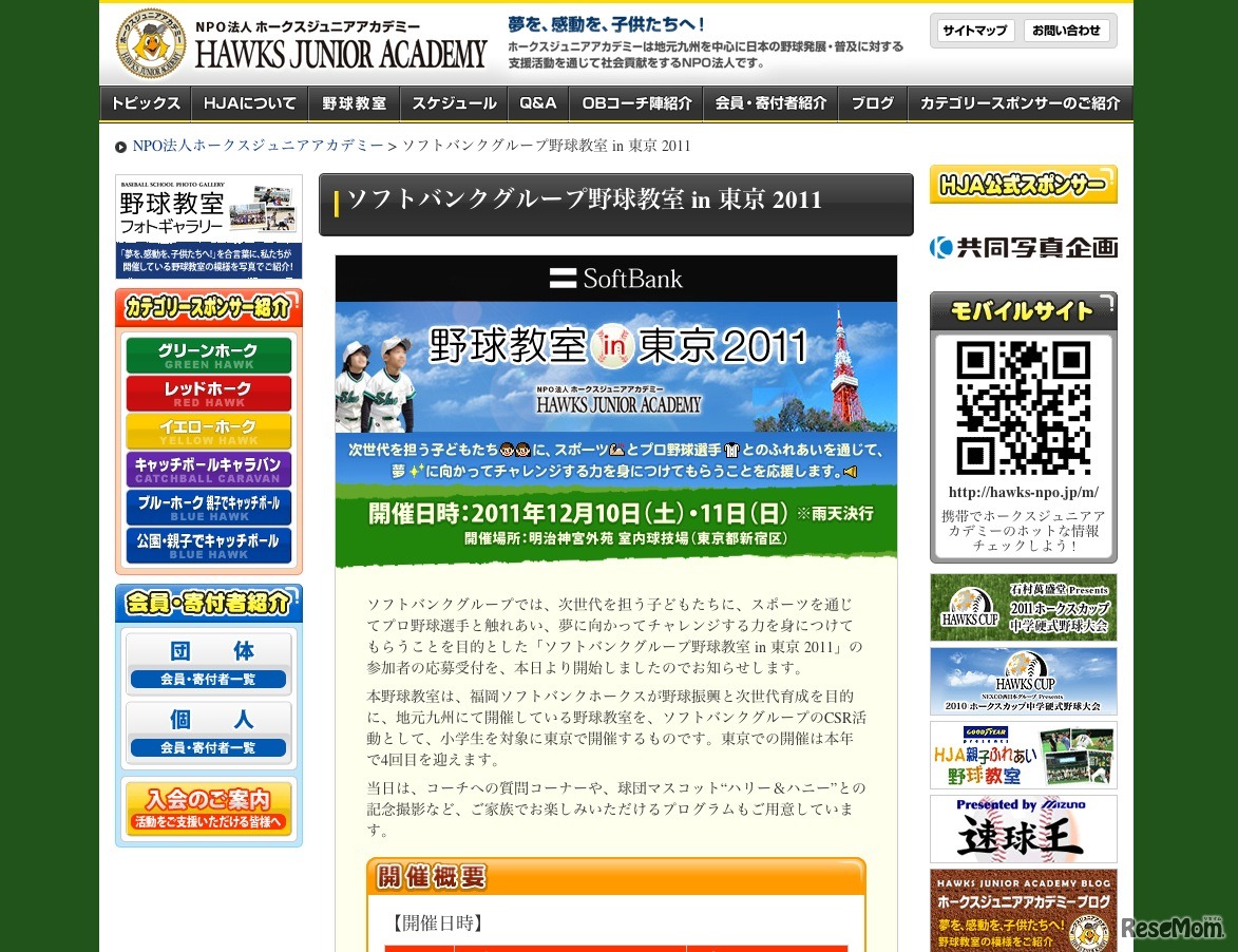 ソフトバンクグループでは、子どもたちにプロ野球選手と触れあい、夢に向かってチャレンジする力を身につけてもらうことを目的とした「ソフトバンクグループ野球教室 in 東京 2011」の参加者の応募受付を、本日10月7日より開始した。