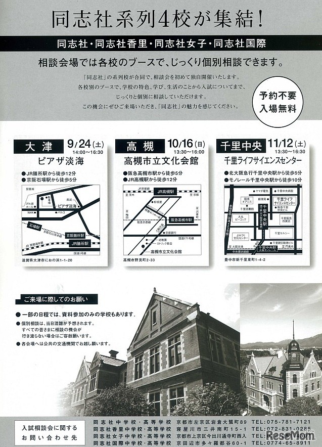 「同志社系列中学校・高等学校合同入試相談会」が10月と11月に高槻と千里中央にて開催される。
