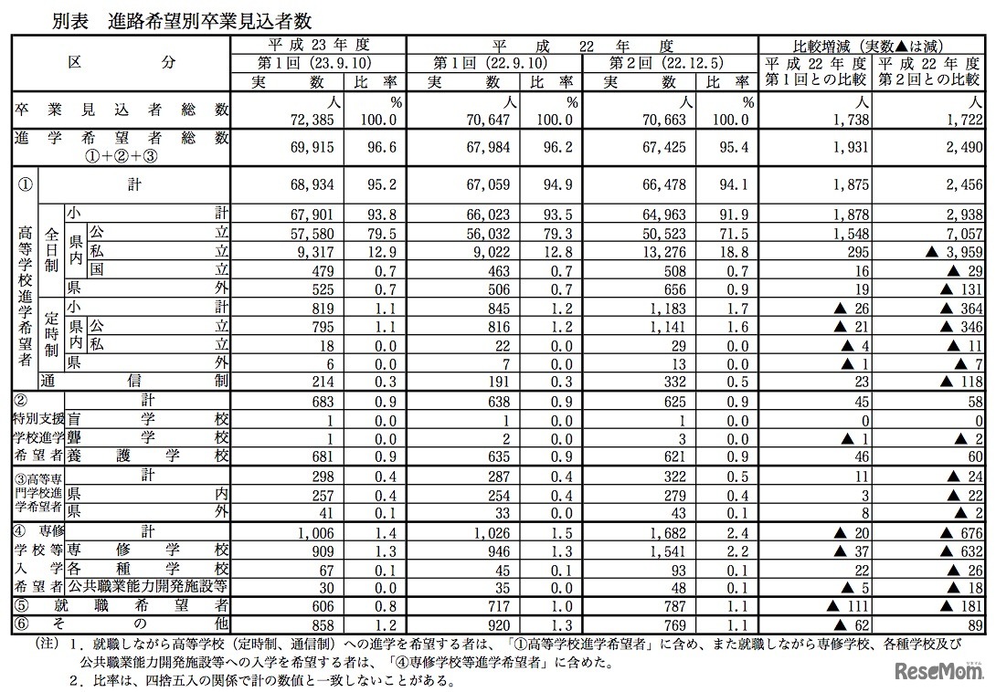 愛知県教育委員会は10月7日、平成24年3月中学校卒業見込者の進路希望状況調査の結果を発表した。