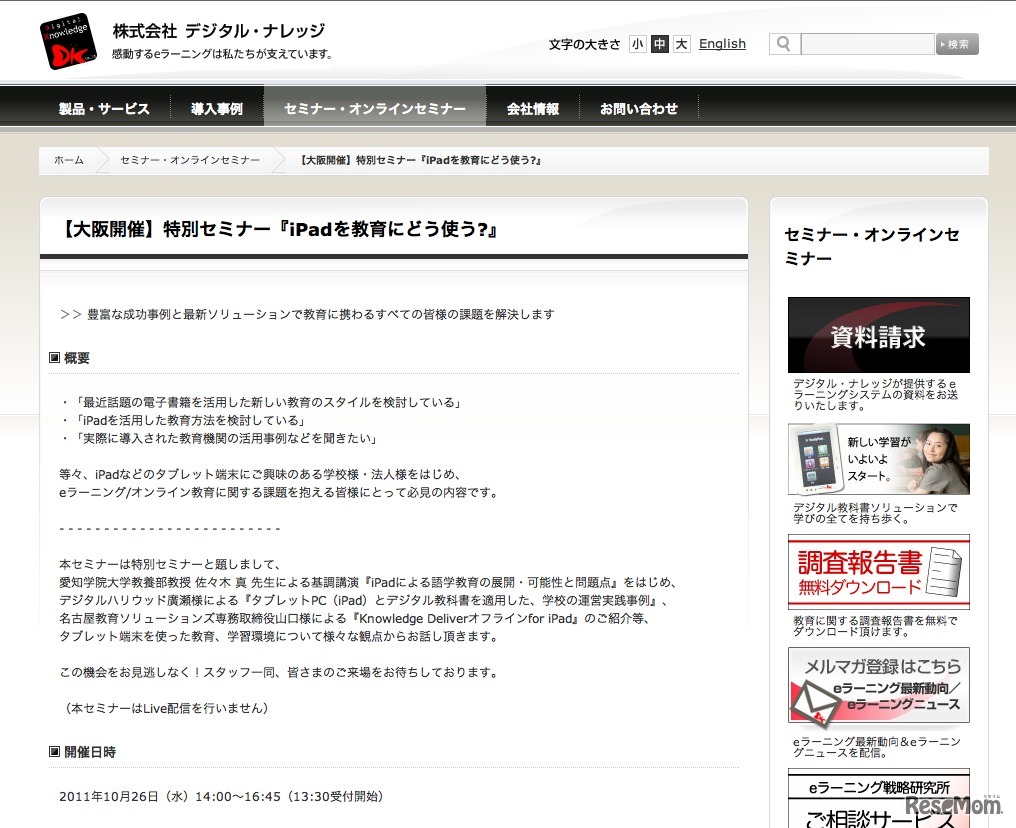 デジタル・ナレッジでは、iPadなどのタブレット端末の教育での利用をテーマとした特別セミナー「iPadを教育にどう使う?」を、10月26日に大阪大学中之島センターにて開催する。
