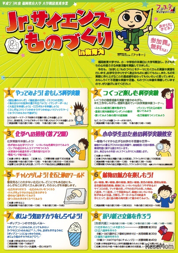 福岡教育大学では、小・中・高等学校の児童・生徒およびその保護者等を対象としたイベント「Jr.サイエンス&ものづくりin教育大」を11月3日に開催する。