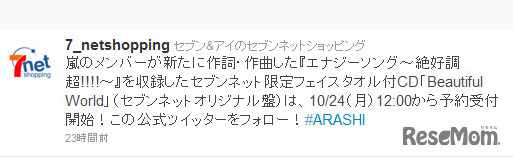 セブン&アイはセブンネットショッピング公式Twitterにおいて、嵐のセブンネット限定フェイスタオル付きCD「Beautiful World」(セブンネットオリジナル盤)の予約受付を、10月24日(月)12時に開始するとツイートした。
