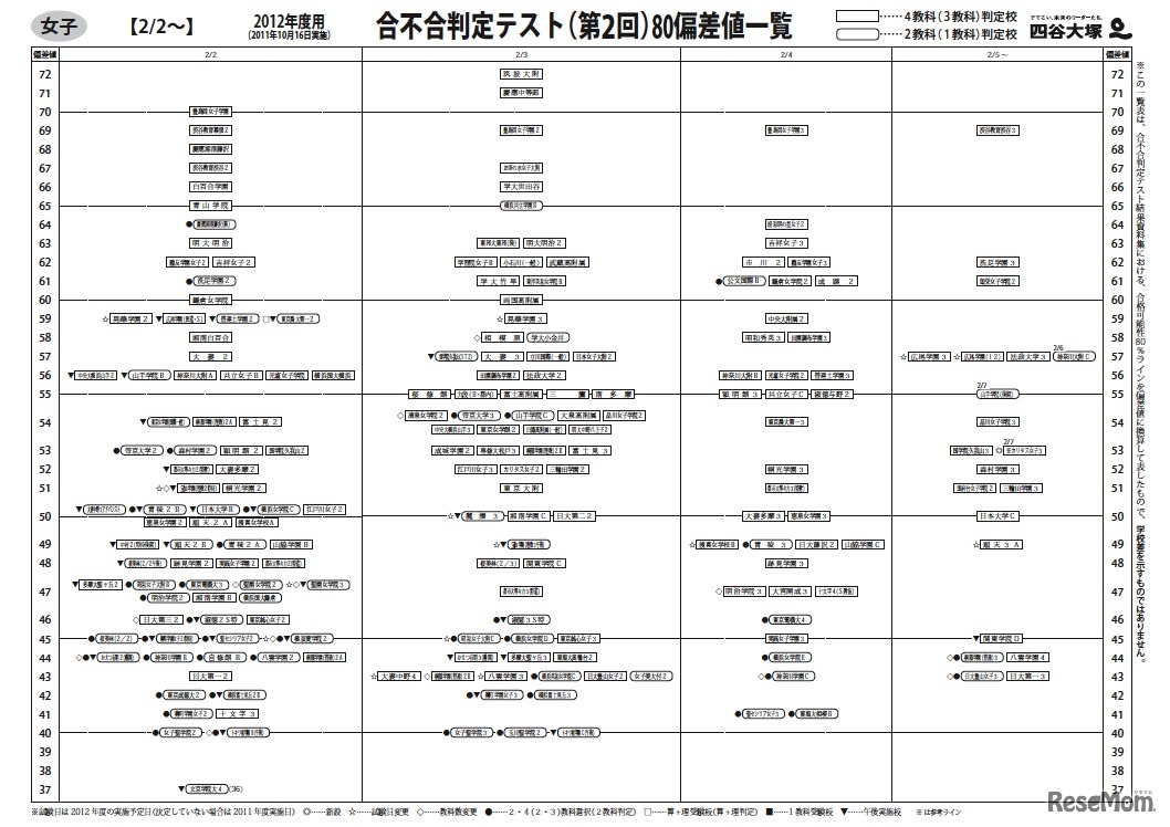 四谷大塚は、ホームページの入試情報センターのページに10月16日に実施した「第2回合不合判定テスト」における偏差値一覧を公開した。