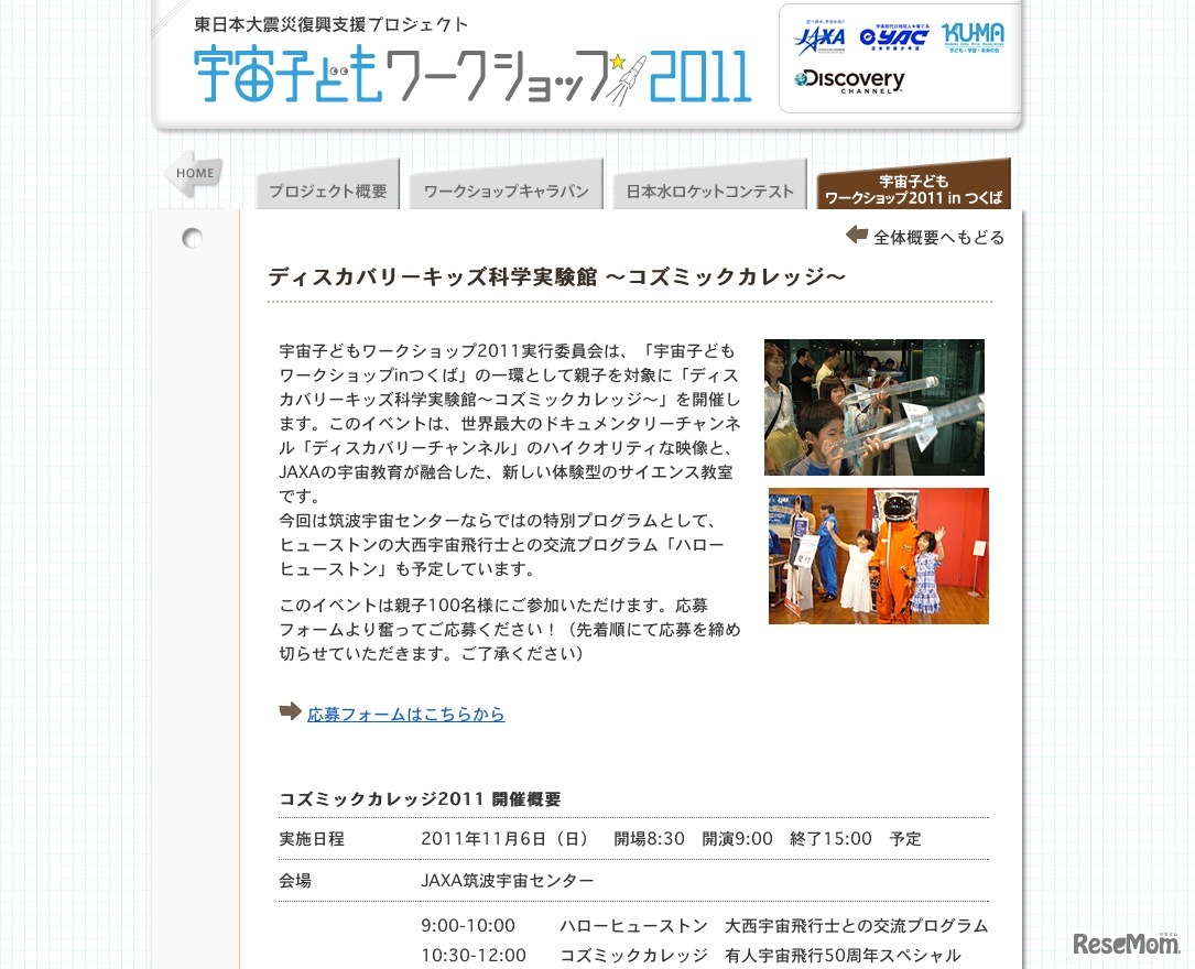 東日本大震災復興支援プロジェクト 宇宙子どもワークショップでは、「宇宙子どもワークショップ2011 in つくば」にて実施されるディスカバリーキッズ科学実験館(コズミックカレッジ)の参加者を募集している。