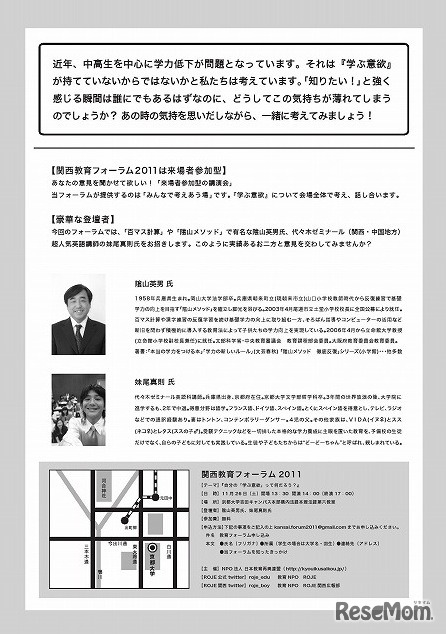 日本教育再興連盟(ROJE:Renaissance Of Japanese Education)は、来場者参加型の講演会 関西教育フォーラム2011「~学ぶ意欲って、なんだろう?~」を11月26日に京都大学で開催する。