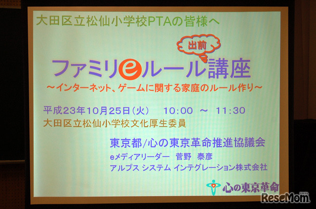 東京都大田区の雪谷文化センターで10月25日、大田区立松仙小学校のPTAを対象とした子どものインターネット利用に関するセミナー「ファミリeルール“出前”講座」が行われた。