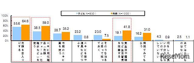 ニキビだできた時、どのように対応しましたか/子どもにニキビができた時、どのように対応していますか