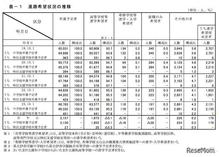 埼玉県は11月1日、平成24年3月中学校等卒業予定者の進路希望状況調査(平成23年10月1日現在)の結果をホームページに掲載した。