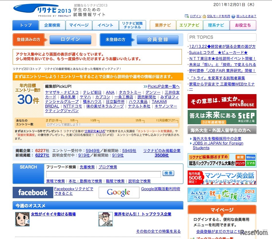 経団連の倫理憲章の改訂により、事実上の解禁日となった本日12月1日、2013年の卒業予定生を対象とした就活サイトが一斉にオープンした。