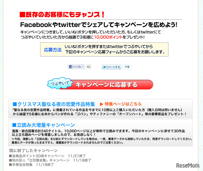 電子書籍販売サイトのeBookJapan(イーブック イニシアティブ ジャパン)は、「1冊分ポイントバックキャンペーン」を開始した。さらに、キャンペーンを広めた方から抽選で3名に10,000ポイントプレゼントする。