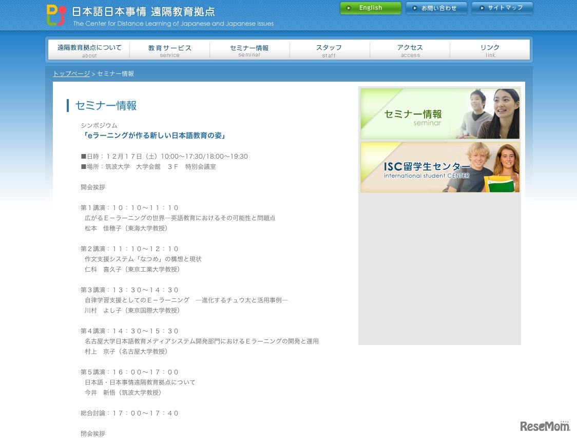 筑波大学日本語・日本事情遠隔教育拠点は、シンポジウム「eラーニングが作る新しい日本語教育の姿」を12月17日に筑波大学において開催する。