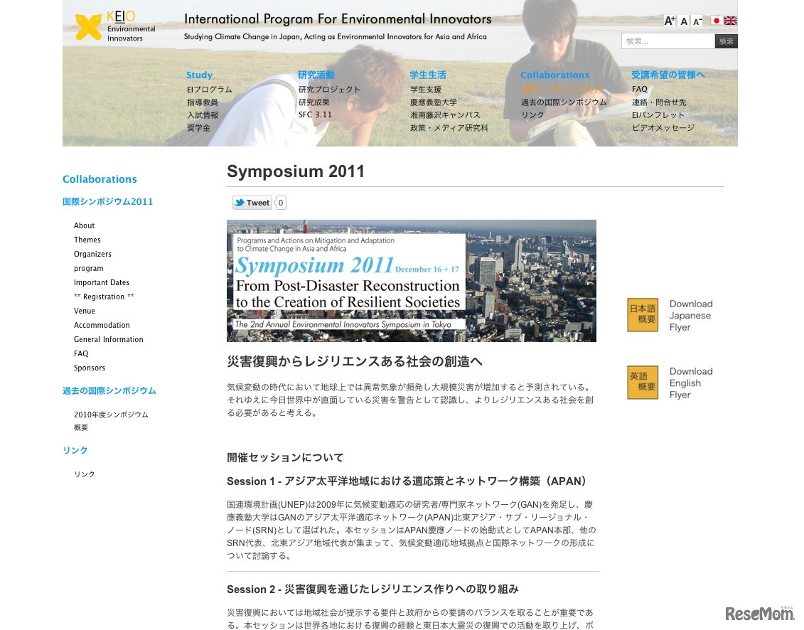 慶應義塾大学は、「戦略的環境リーダー育成拠点形成事業国際シンポジウム2011」を12月16日、17日に開催する。