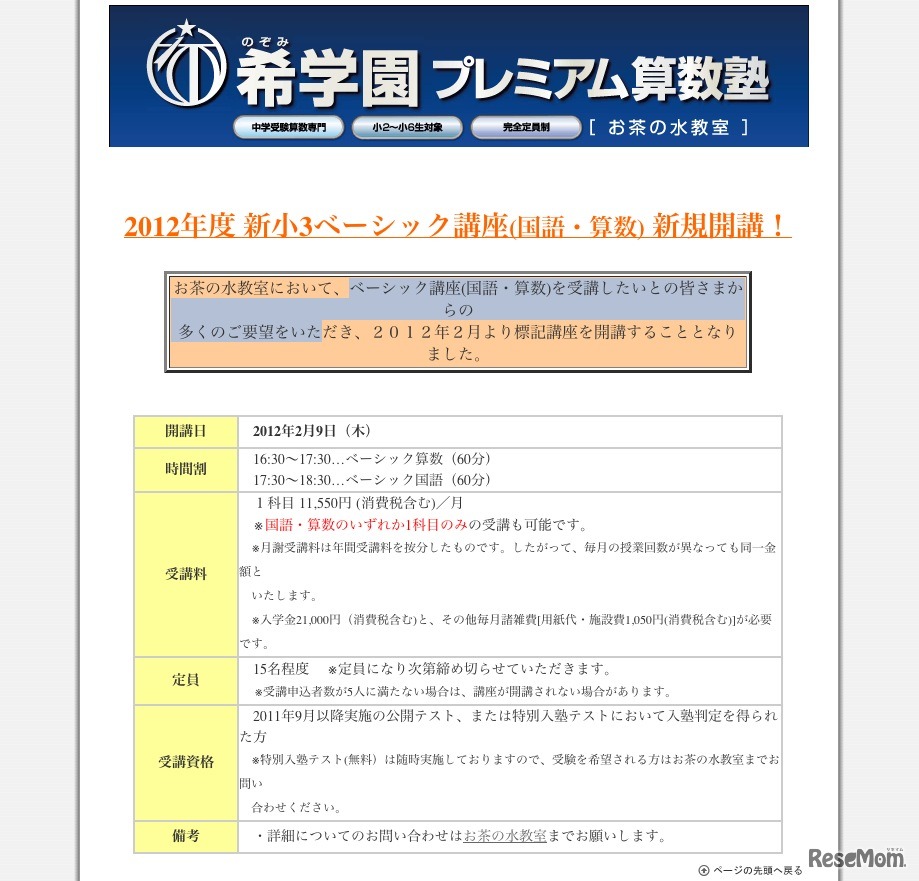 希学園は12月16日、お茶の水教室で「新小3ベーシック講座(国語・算数)」を2012年2月に新規開講すると発表した。国語・算数のいずれか1科目のみの受講も可能となっている。