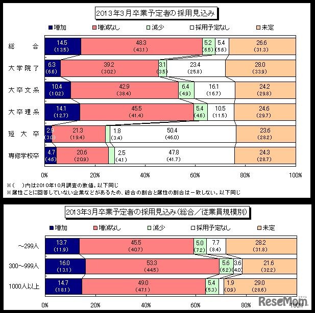 ディスコは12月16日、全国の主要企業を対象に、2013年3月卒業予定者等の「採用活動に関する企業調査」を行った結果を公開した。新卒採用見込みは、全属性の総合で「増減なし」が48.3%を占めた。
