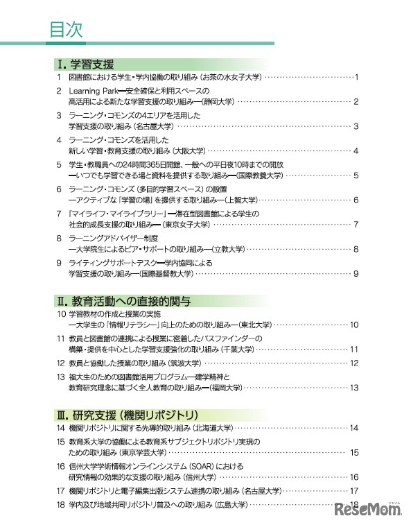 文部科学省は、「大学図書館における先進的な取り組みの実践例-大学の学習・教育・研究活動の質的充実と向上のために-」と題した資料をホームページに公開している。お茶の水女子大学など9大学の事例を紹介している。