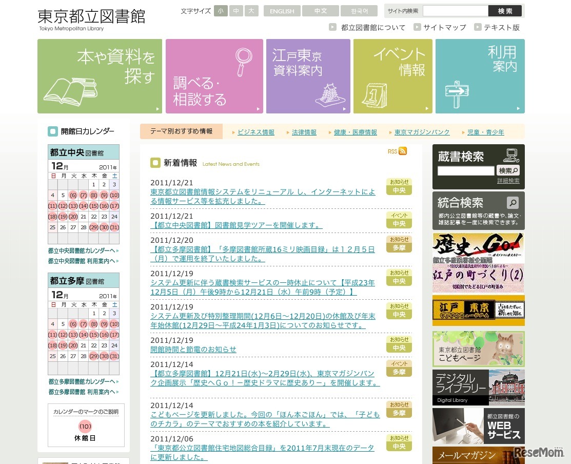東京都は12月20日、東京都立図書館の図書館情報システムをリニューアルし、インターネットによる情報提供サービスを拡充を発表。「統合検索システム」など新システムの運用を21日より開始した。