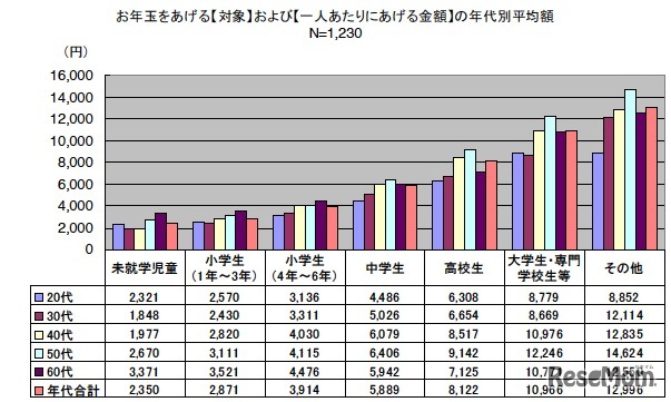 お年玉をあげる対象および一人当たりにあげる金額の年代別平均額
