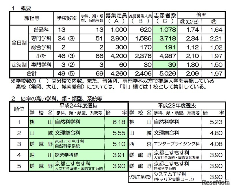 京都府教育庁は2月3日、平成24年度の府立高等学校入学者選抜における、推薦入学および特色選抜などの志願者数をホームページに公表した。
