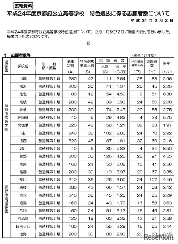 京都府教育庁は2月3日、平成24年度の府立高等学校入学者選抜における、推薦入学および特色選抜などの志願者数をホームページに公表した。