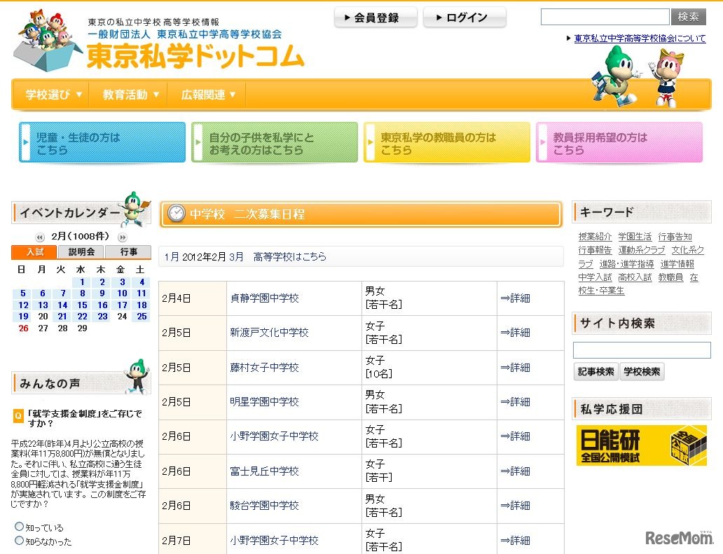 東京都生活文化局は2月2日、平成24年度都内私立中学校の第2次募集の状況について発表。東京私立中学高等学校協会のとりまとめによると、33の募集学校のうち、男子校が2校、女子校19校、男女校12校だという。