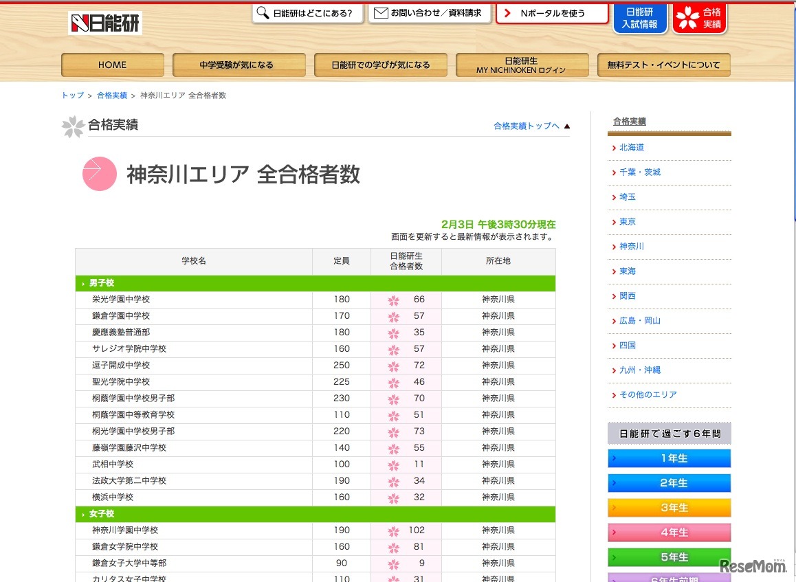 日能研は2月3日、ホームページの合格実績ページを更新し、本日合格発表の行われた開成中学校、麻布中学校、栄光学園中学校、聖光学院中学校などの合格者数の掲載を開始した。