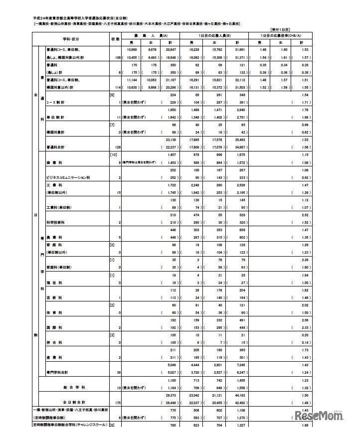 平成24年度東京都立高等学校入学者選抜応募状況(全日制)