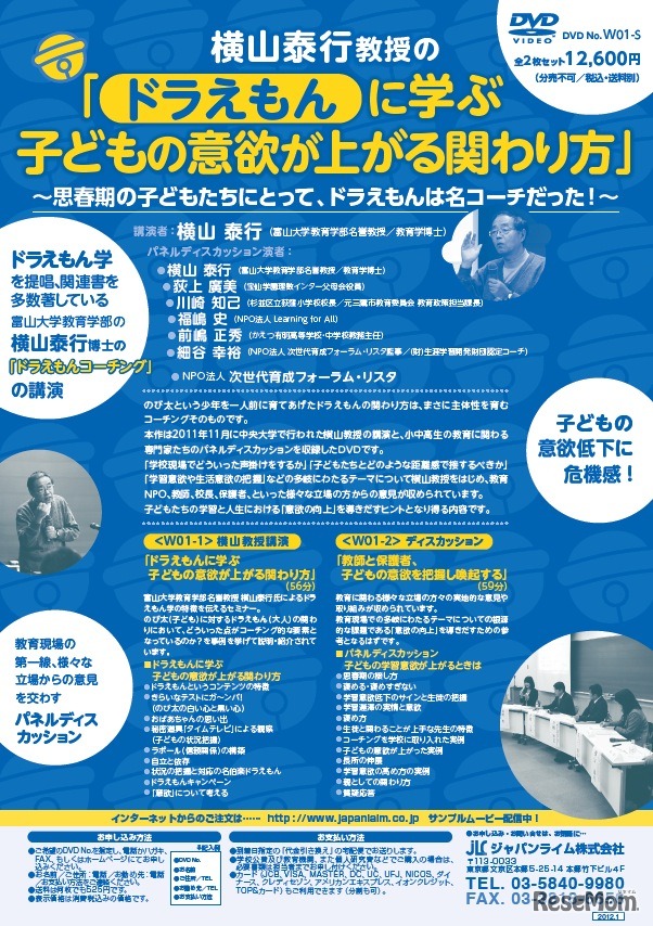 ジャパンライムは2月8日、富山大学教育学部の名誉教授・横山泰行氏のコーチングセミナーおよび教育関係者によるパネルディスカッションを収録したDVD「ドラえもんに学ぶ子どもの意欲が上がる関わり方」の発売について発表した。