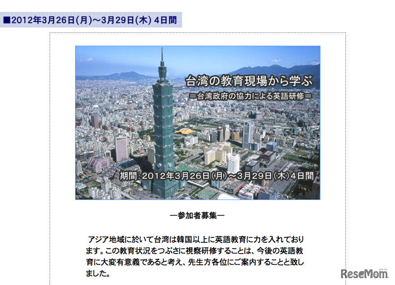 前年、韓国の小、中、高校の英語教育現場ツアーを実施した全国英語教育研究団体連合会は、台湾の英語教育事情の視察ツアー参加者を募集している。