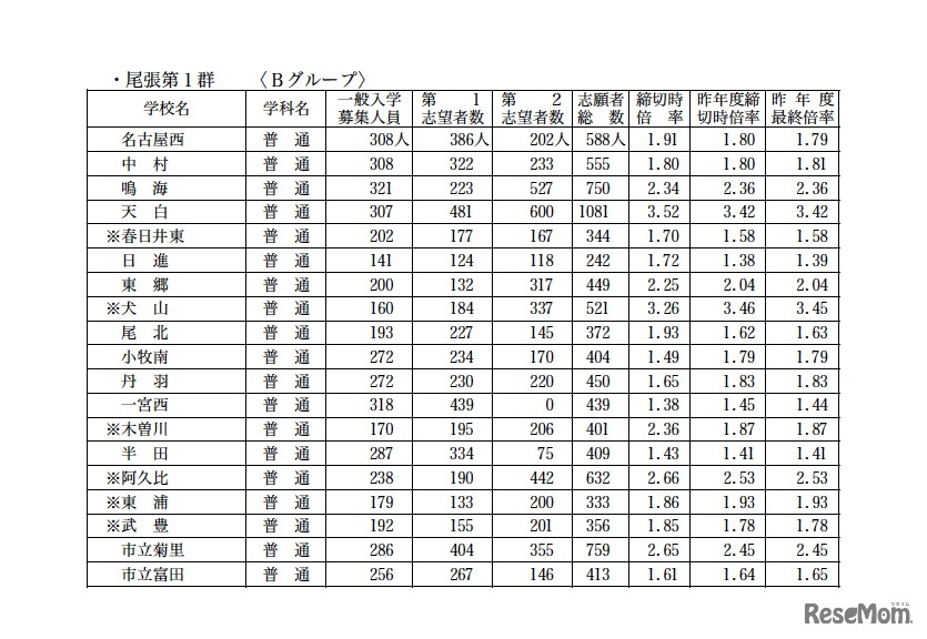 愛知県は2月23日、平成24年度愛知県公立高等学校入学者選抜における全日制一般入学入学願書受付締切後の志願者数について発表した。資料では、普通科の各学校の募集人員と第1志望者数、第2志望者数、志願者総数、締切時の倍率などをまとめた一覧表が掲載されている。