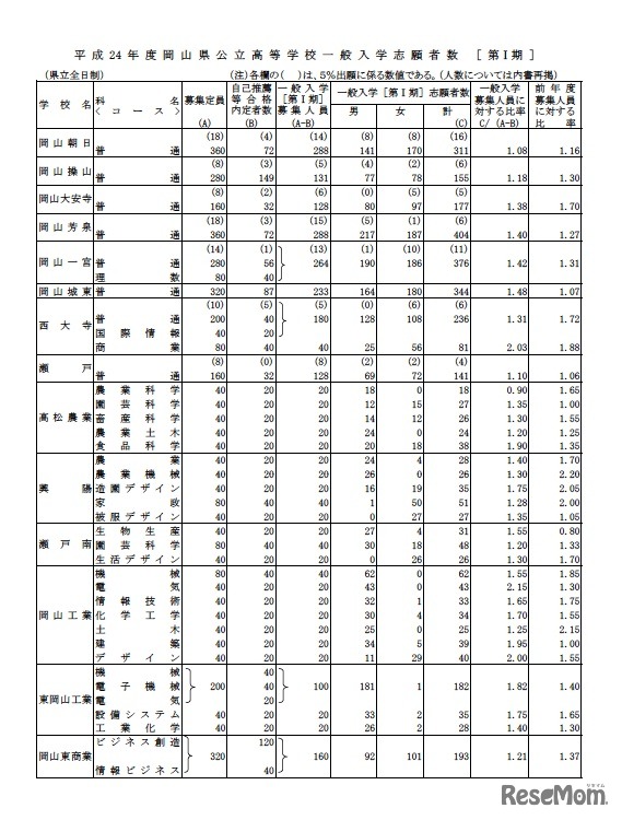 岡山県は2月28日、平成24年度岡山県公立高等学校一般入学者選抜(第1期)志願者数についてホームページに公開した。県立全日制は52校で募集定員12,425人、一般入学募集人員7,795人に対する志願者数は9,328人で倍率は1.20倍(昨年1.20倍)。