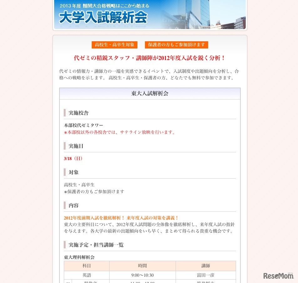 代々木ゼミナールは、高校生・高卒生を対象にした「大学入試解析会・分析会」を3月3日より順次開催する。代ゼミの精鋭講師陣が2012年度入試を分析するとともに、来年度入試の指針を与える。