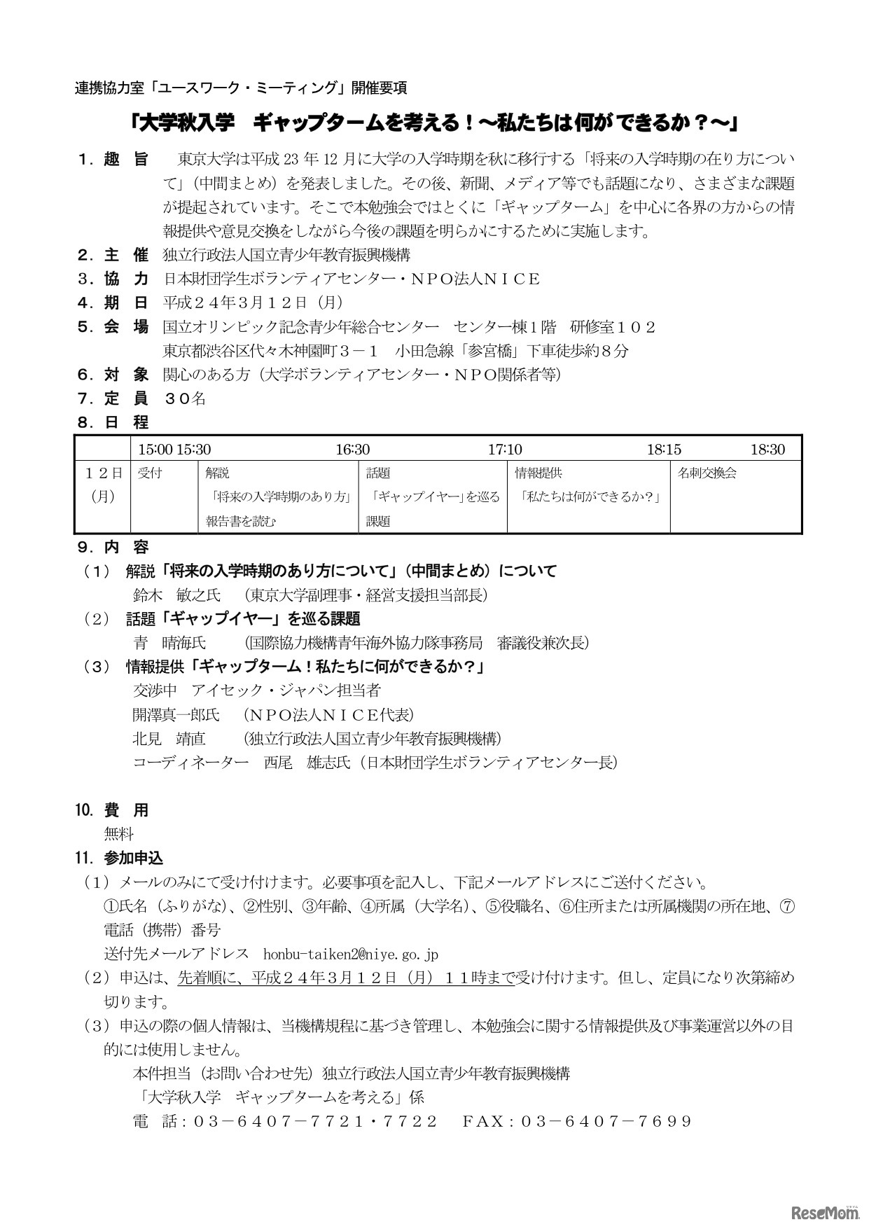 国立青少年教育振興機構では、連携協力室・ユースワーク・ミーティング「大学秋入学 ギャップタームを考える!〜私たちは何ができるか?〜」を、3月12日に国立オリンピック記念青少年総合センターで開催する。