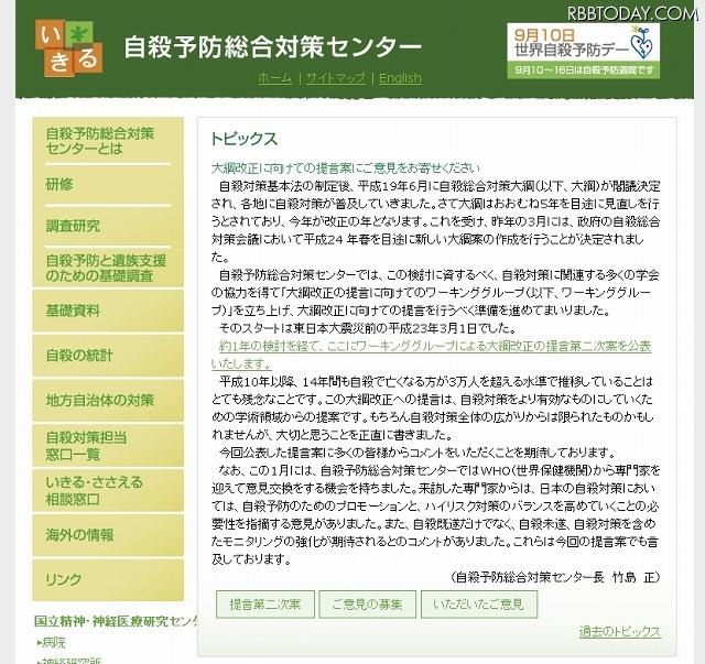 検索サービスを提供する9社は日、検索サービスを通じた自殺予防に共同で取り組んでいくことで合意したことを連名で発表した。エキサイト、NECビッグローブ、NTTコミュニケーションズ、NTTドコモ、NTTレゾナント、So-net、ニフティ、ヤフー、楽天の9社となる。