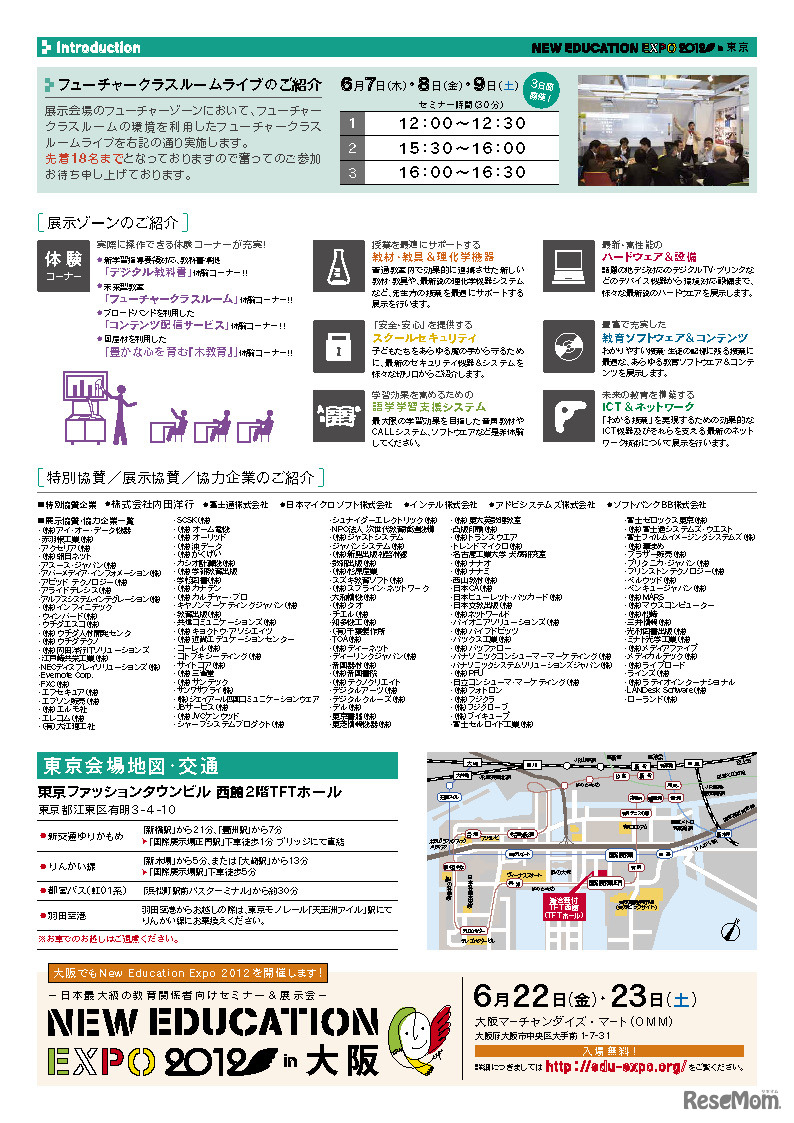 New Education Expo実行委員会では、日本最大級の教育関係者向けセミナー&展示会「New Education Expo 2012」を、6月7日〜9日に東京ファッションタウン(TFTビル)、22日と23日に大阪マーチャンダイズ・マートにて開催する。
