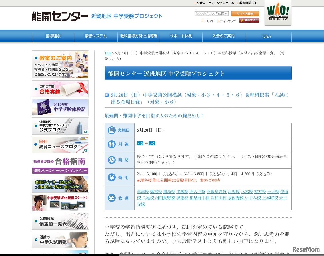 能開センターでは、小学3年生から6年生を対象とした「中学受験公開模試」と、小学6年生が対象の理科授業「入試に出る金環日食〜2013年度入試を予測する〜」を5月20日に実施する。