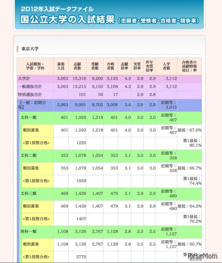 代々木ゼミナールは5月23日、ホームページの入試情報コーナーに、2012年の国公立大学の入試結果について、志願者、受験者、合格者、競争率を大学別にまとめたデータページ「2012年国公立大学の入試結果」を公開した。