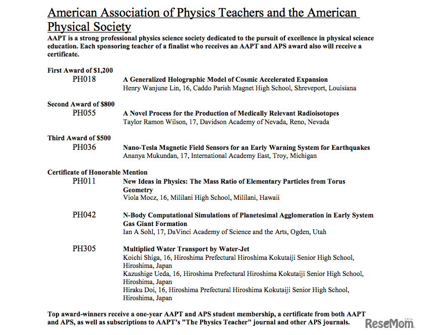 インテルがメイン・スポンサーを務める2012年インテル国際学生科学フェア(Intel ISEF)が5月13日から18日まで米国ペンシルベニア州で行われ、日本代表チームが佳作に入選した。