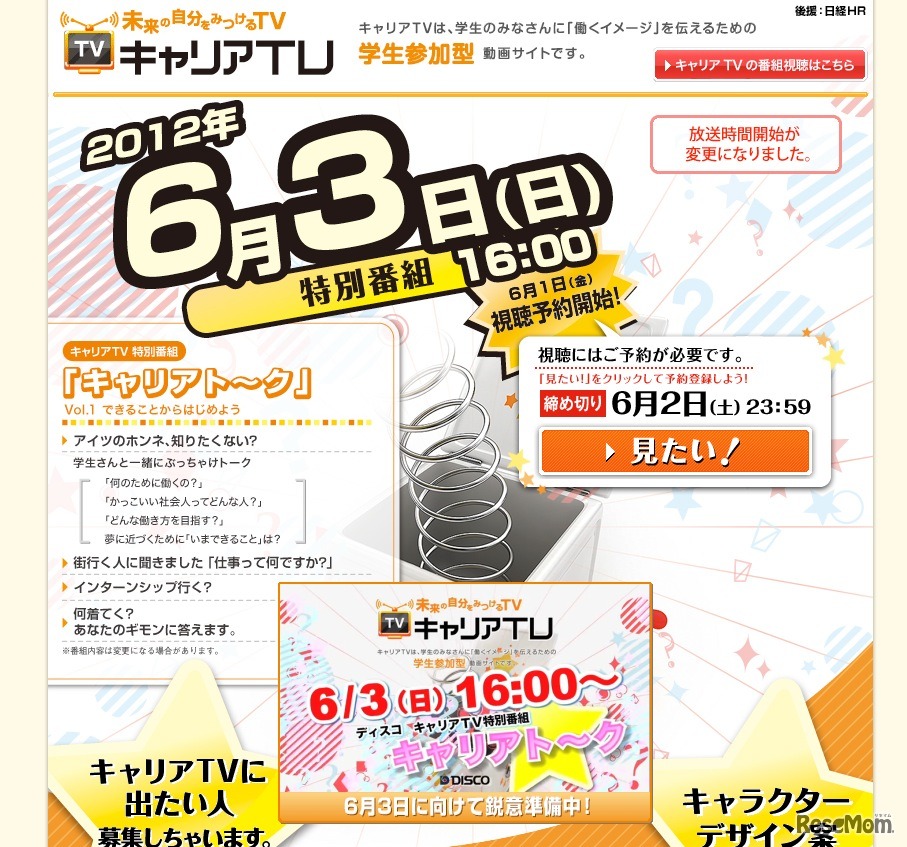 就職情報会社のディスコでは、将来の就職を考える学生に向けた学生参加型動画サイト「キャリアTV」にて、特別番組「キャリアト〜ク」の生放送を6月3日の午後4時より実施する。