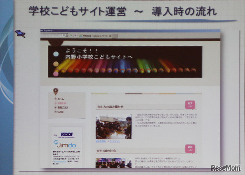 学校こどもサイト。Jimdoの無料版を利用しているのでKDDIの広告が表示されている