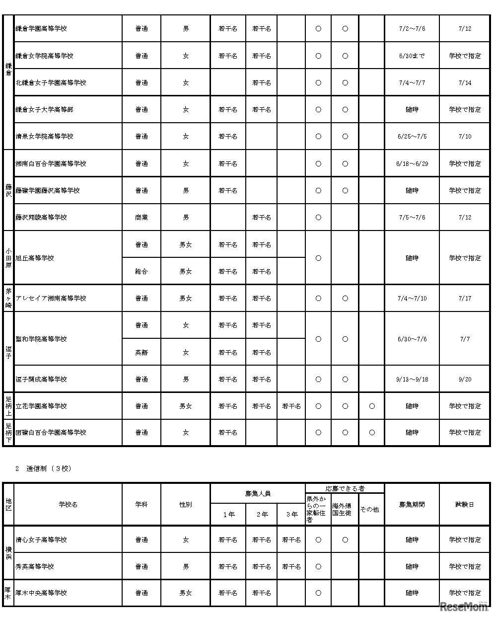 神奈川県は、平成24年度2学期受入れの私立中学・高等学校等転・編入学試験実施計画についてホームページに公開している。2学期からの転・編入学試験を実施するのは、全日制高等学校36校、通信制高等学校3校、中学校33校、中等教育学校2校となっている(6月1日現在)。