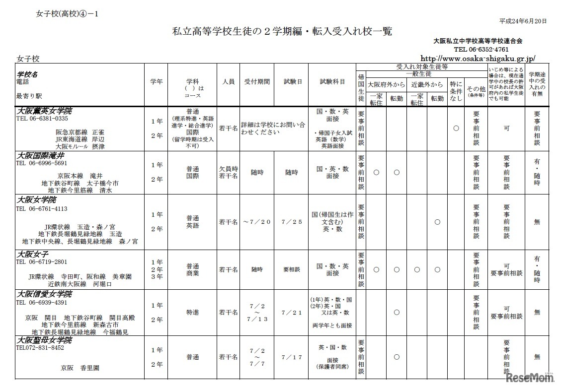 大阪私立中学校高等学校連合会は6月20日、「平成24年度2学期編・転入受入校情報(中学校・高等学校)」をホームページに掲載した。私立中学校で転・編入入試を行うのは38校、私立高校では57校となっている。