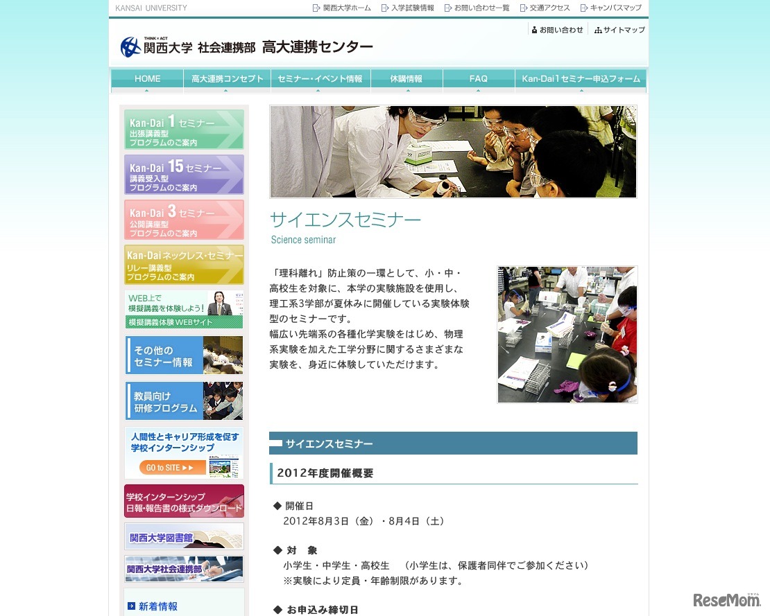 関西大学高大連携センターでは、小・中・高校生を対象とした「第13回サイエンスセミナー」を8月3日、4日に千里山キャンパスで開催する。同イベントは、児童・生徒の理科離れ防止策の一環として、同学の実験施設を使用し、理工系3学部が夏休みに実施する体験型のセミナー。